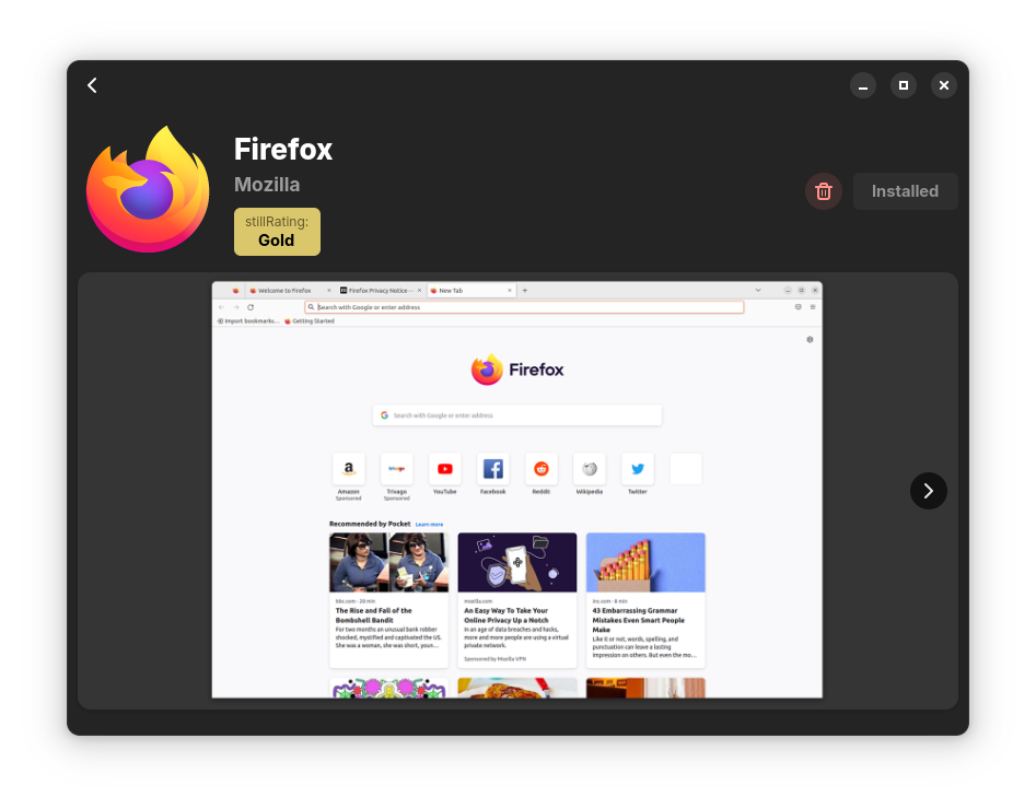 stillOS comes with a curated app store called stillCenter to ensure quality apps are available for stillOS. stillCenter is designed to make installing and discovering new desktop and web apps as easy possible. Most apps come with a stillRating that grade how well they work with stillOS to ensure a good user experience.