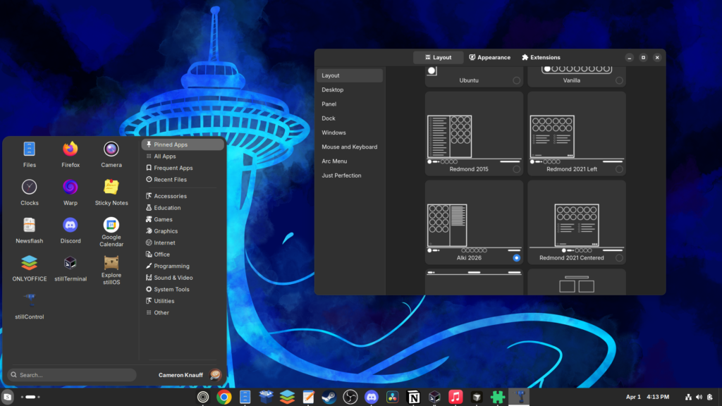 Vanilla GNOME can have a learning curve, so we have a default layout that is supposed to be a merge of Windows and macOS, but also a tool called stillControl with a layout switcher, an easy set of options to configure your own user layout, and an extension manager and store built right in. Just open stillControl, click the base layout you are the most comfortable with for your work, and than tweak it to your liking.