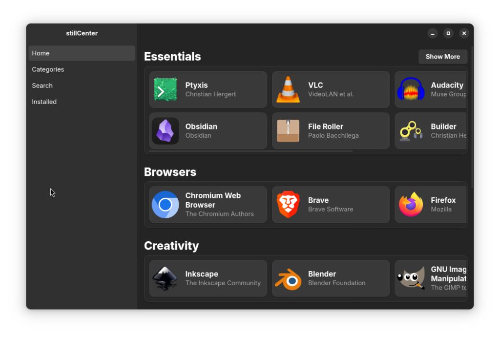 To solve all of these problems, we built our own ground-built software center with a curated store. Apps are only listed on the software center if they are high quality, work well on stillOS, and if they are using a non-GTK toolkit, but has a Libadwaita alternative, they will not be listed. We do this to prevent people installing low-quality apps and than blaming Linux/stillOS, and to prevent beginners from installing basic KDE apps on GNOME (no shade on KDE, but KDE apps have poor system integration on GNOME).