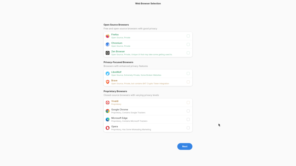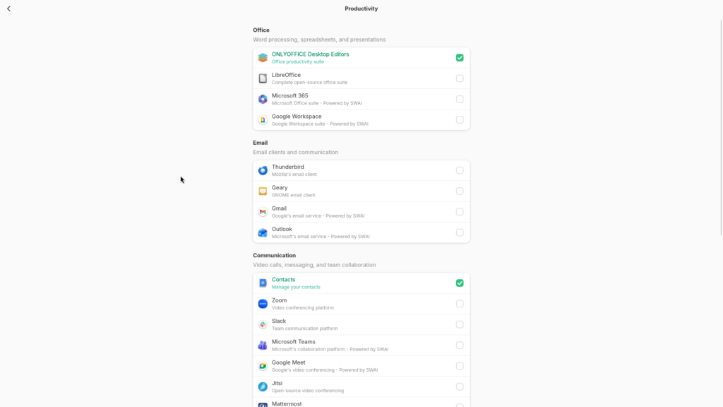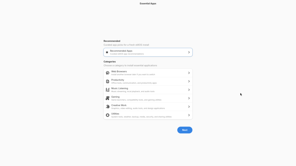 On first boot of stillOS, you can quickly install whatever applications you need for your work, and get up and running in light speed. The point of Quick Setup is to let people choose what apps they want preinstalled, rather than having a giant ISO filled to the brim full of random applications, as well as a way of recommending apps to new users who may not know what apps they need. Just choose apps, and get going in a few clicks.